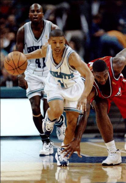 CHARLOTTE, N.C., 21-FEB-97: Los Angeles Clippers' forward Rodney Rogers (R) tries to slow down Charlotte Hornets' guard Muggsy Bogues after he stole the ball from Rogers during first half NBA action in the Charlotte Coliseum February 21. In the background is Hornets Glen Rice.
